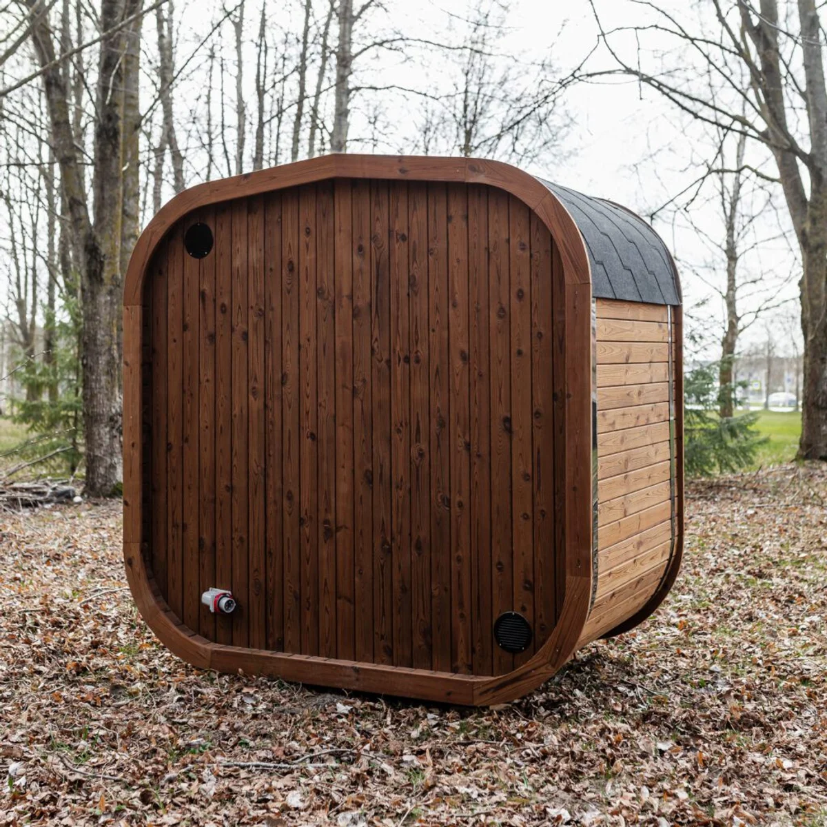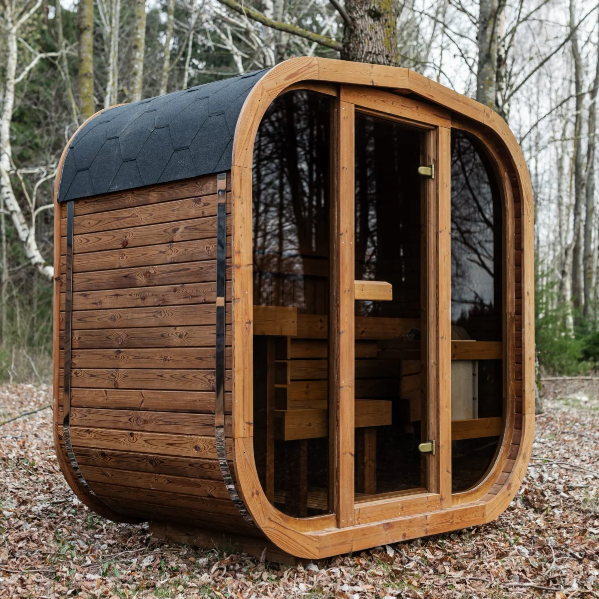 Full-size compact DIY barrel sauna crafted from premium thermally modified wood. Features metal-banded barrel construction with 44mm thermowood walls for superior durability. Panoramic tempered glass windows maximize views while maintaining heat efficiency. The 2.0m version comfortably accommodates 3-4 people. Delivered as complete DIY kit with step-by-step assembly manual. Perfect balance of compact footprint and family-friendly capacity.