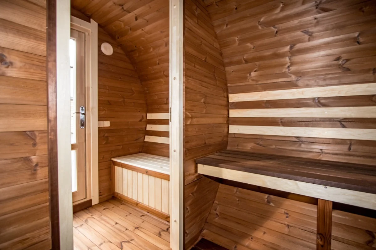 A spacious round sauna measuring 3.90m in length and 2.35m in diameter, featuring a 2.30m sauna room and a 1.16m anteroom. Equipped with a Skamet wood-fired stove, alder benches, tempered glass door, double-glazed windows, LED lighting, and a bitumen shingle roof. Constructed from 45mm thermowood.