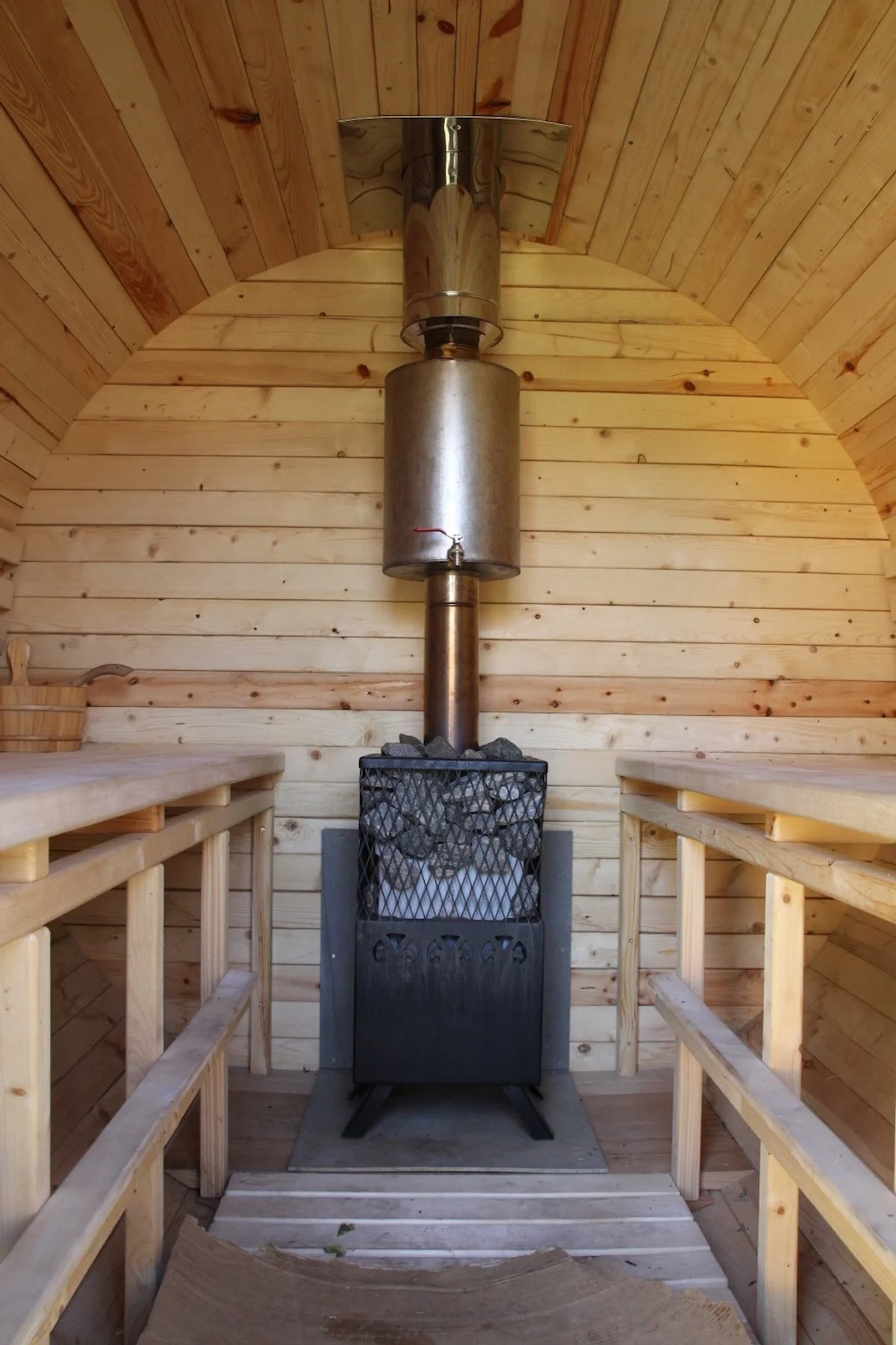 Просторная круглая сауна длиной 3.90м и диаметром 2.35м, включает парную 2.30м и предбанник 1.16м. Оснащена дровяной печью Skamet, лавками из ольхи, закалённой стеклянной дверью, двухкамерными окнами, светодиодным освещением и крышей из битумной черепицы. Изготовлена из термодерева толщиной 45мм.