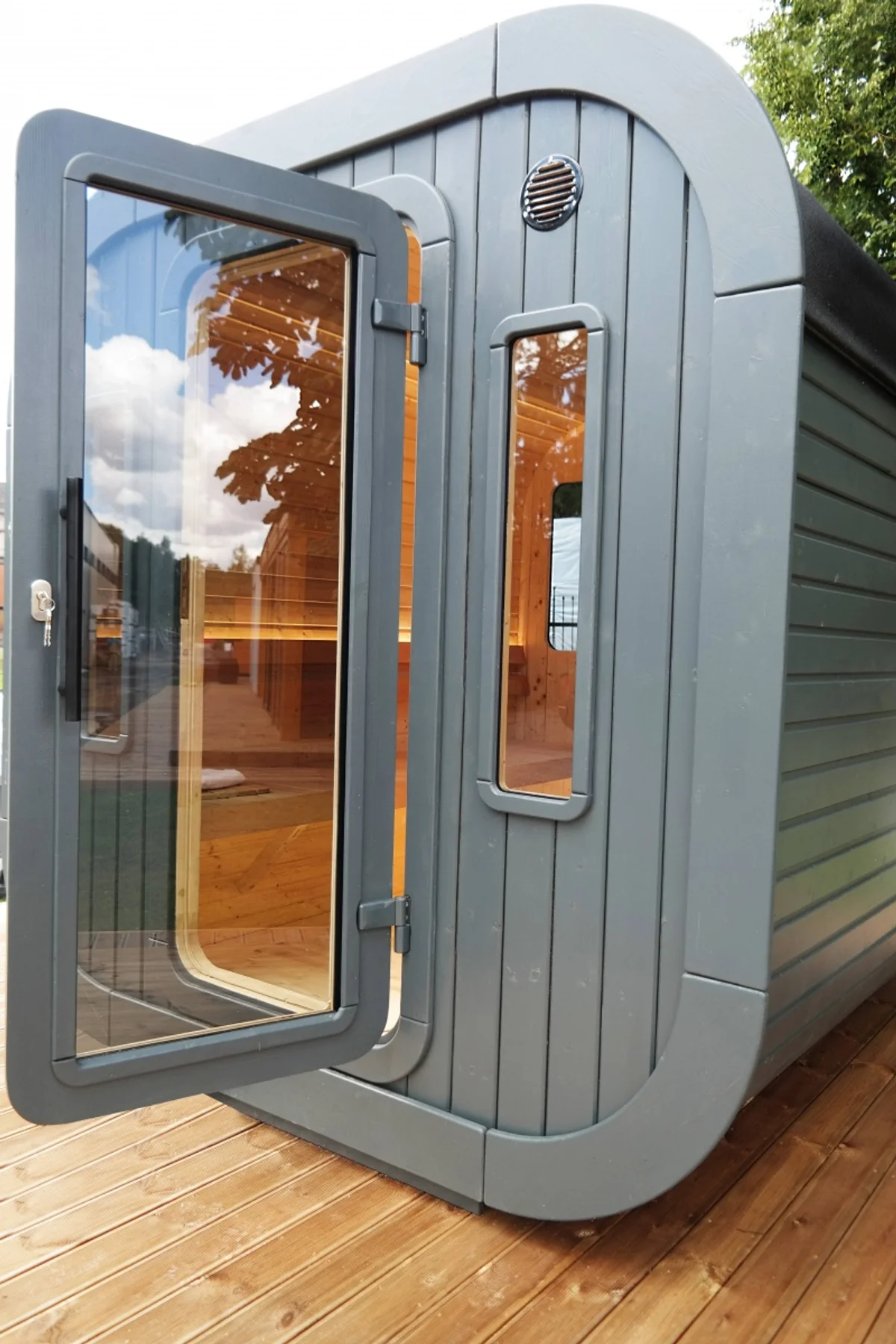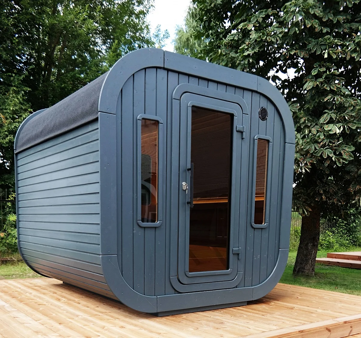Lux — это современная уличная сауна с утеплёнными стенами (125 мм), минеральной ватой (100 мм) и пароизоляцией. Оснащена 4 окнами из закалённого стекла, стильной отделкой, печью Harvia на дровах, системой вентиляции и освещением. Доставляется в собранном виде.