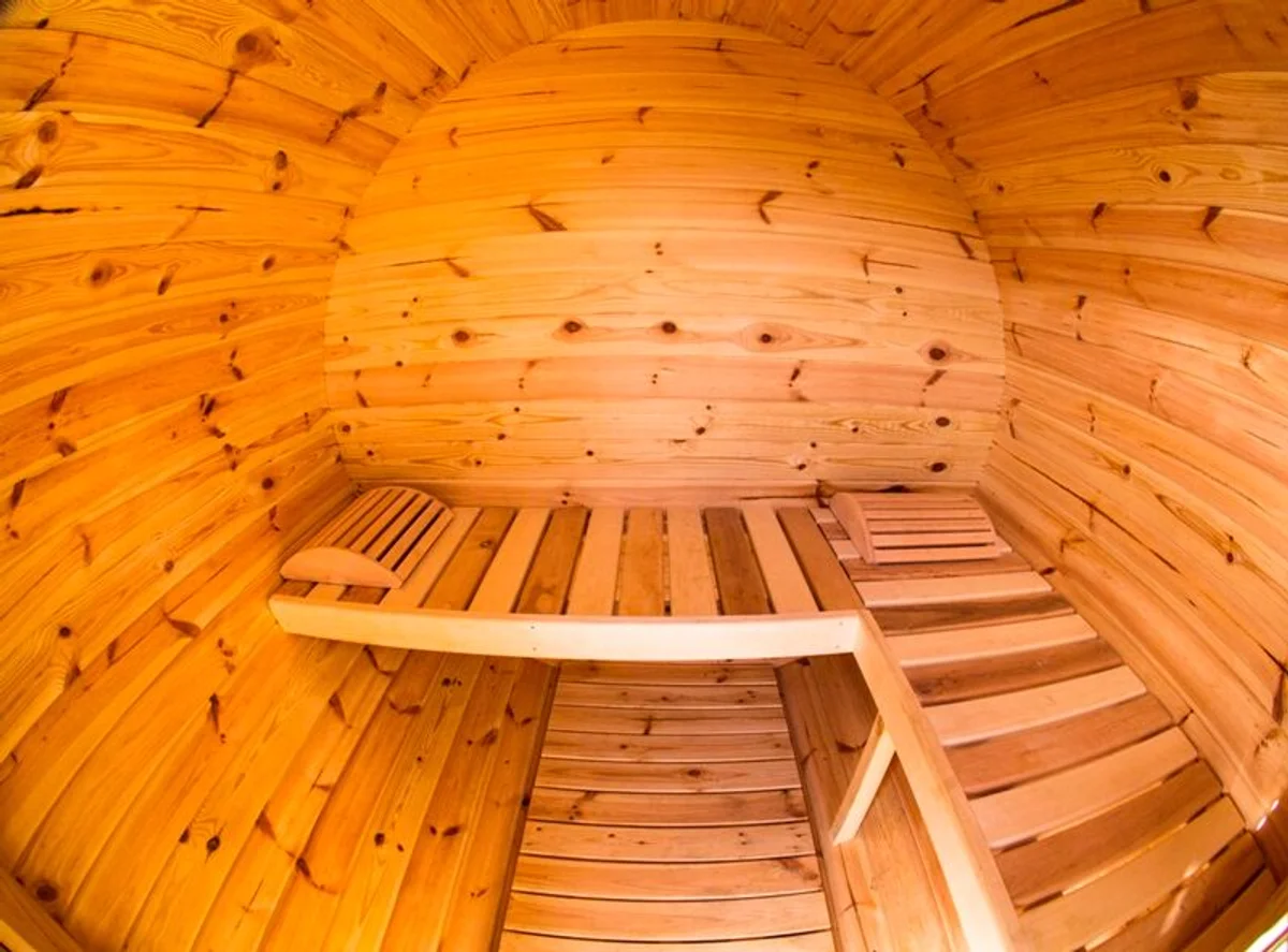 Компактная уличная баня-бочка длиной 1.7 м и диаметром 1.97 м. Построена из строганных сосновых досок толщиной 46 мм, скреплённых металлическими обручами. Включает электропечь Harvia Vega BC80 (8 кВт), крышу из битумной черепицы, стеклянную дверь и поставляется в собранном виде.