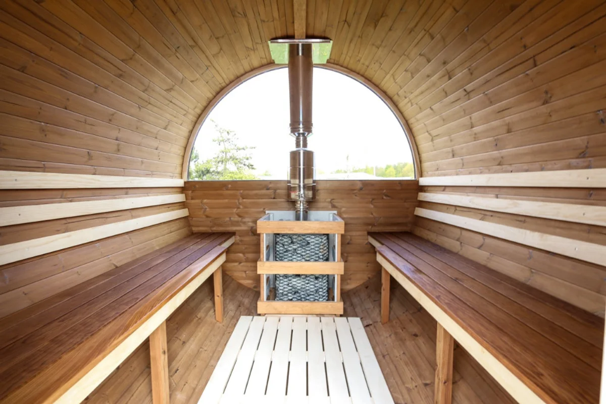 A spacious round sauna measuring 3.90m in length and 2.35m in diameter, featuring a 2.30m sauna room and a 1.16m anteroom. Equipped with a Skamet wood-fired stove, alder benches, tempered glass door, double-glazed windows, LED lighting, and a bitumen shingle roof. Constructed from 45mm thermowood.