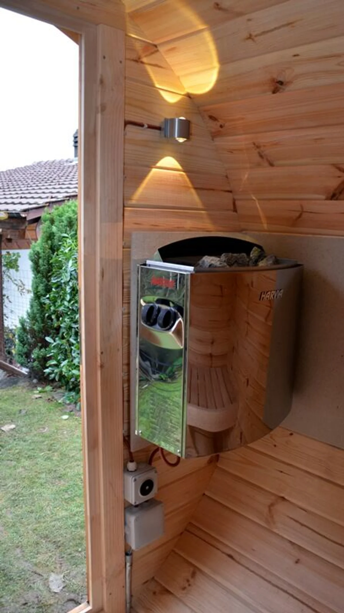 Компактная уличная баня-бочка длиной 1.7 м и диаметром 1.97 м. Построена из строганных сосновых досок толщиной 46 мм, скреплённых металлическими обручами. Включает электропечь Harvia Vega BC80 (8 кВт), крышу из битумной черепицы, стеклянную дверь и поставляется в собранном виде.
